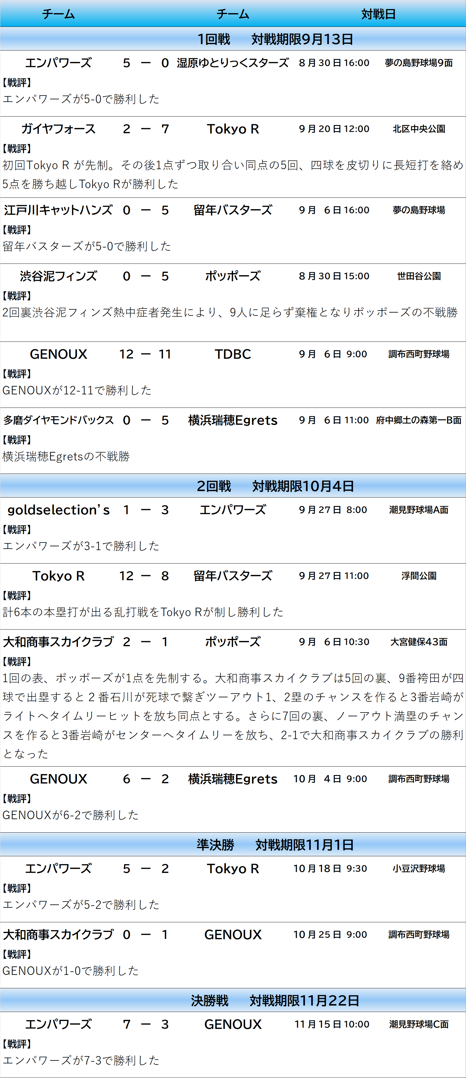 勝点>勝利数>不戦勝数*>失点数*>得失点差>直接対決結果で順位が決定