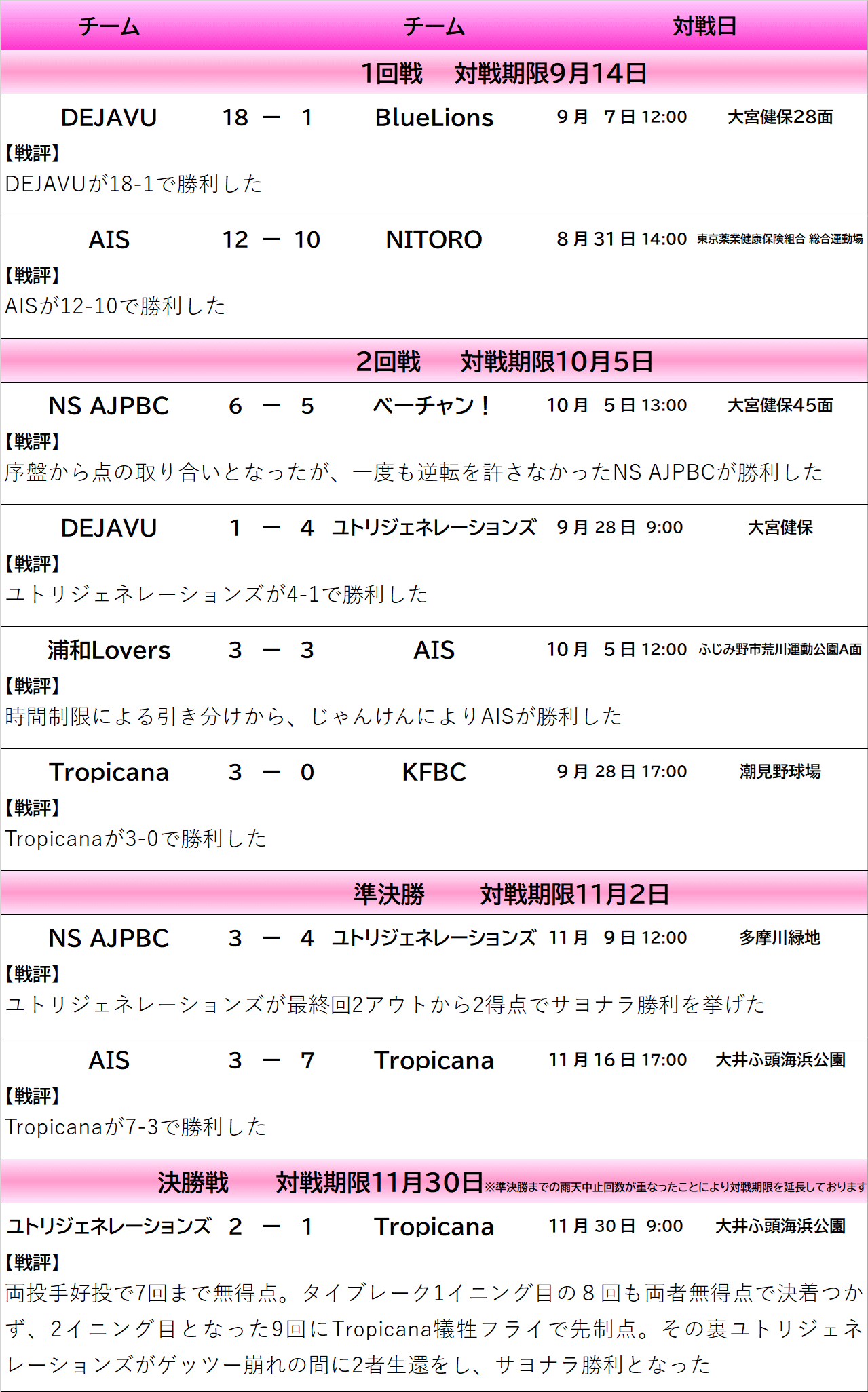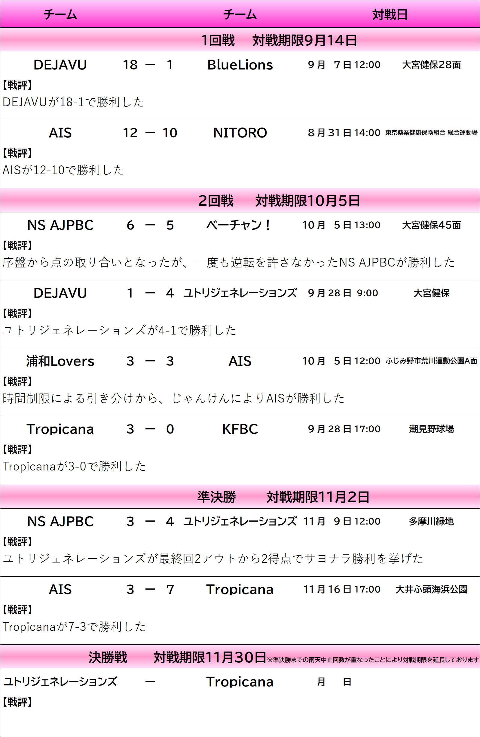 勝点>勝利数>不戦勝数*>失点数*>得失点差>直接対決結果で順位が決定