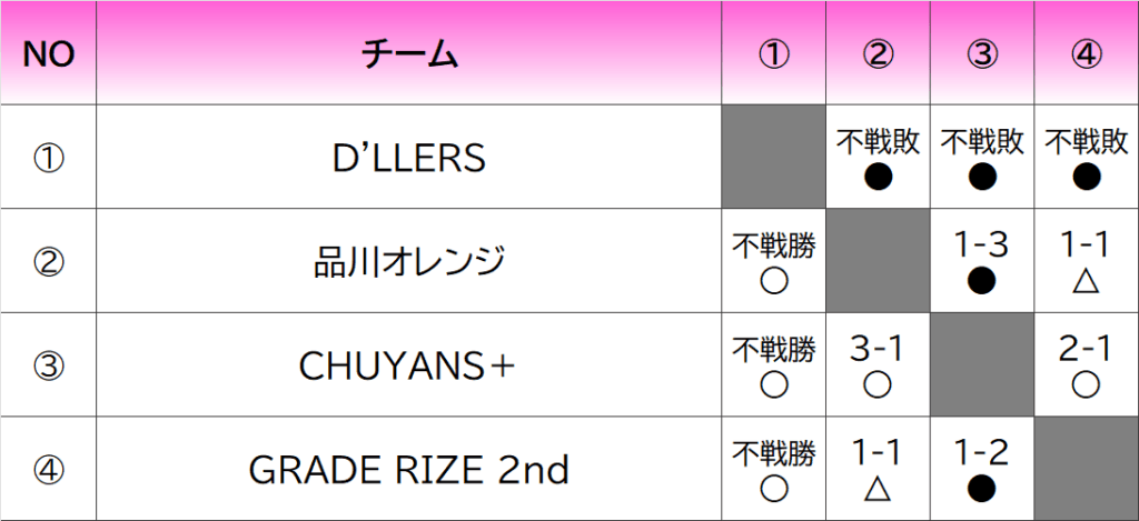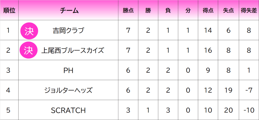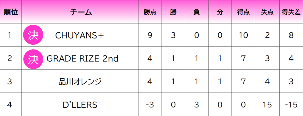 勝点>勝利数>不戦勝数>失点数>得失点差>直接対決結果で順位が決定