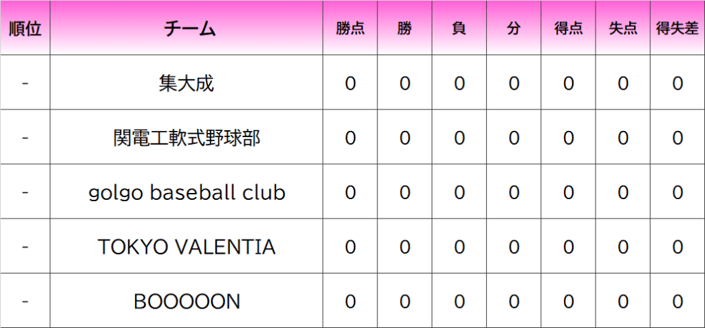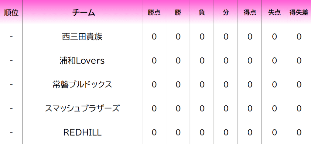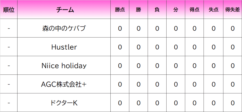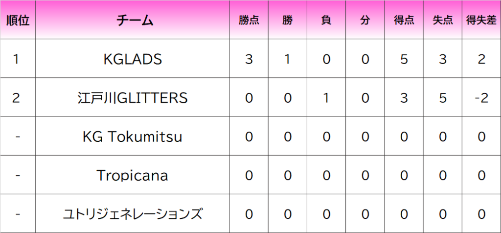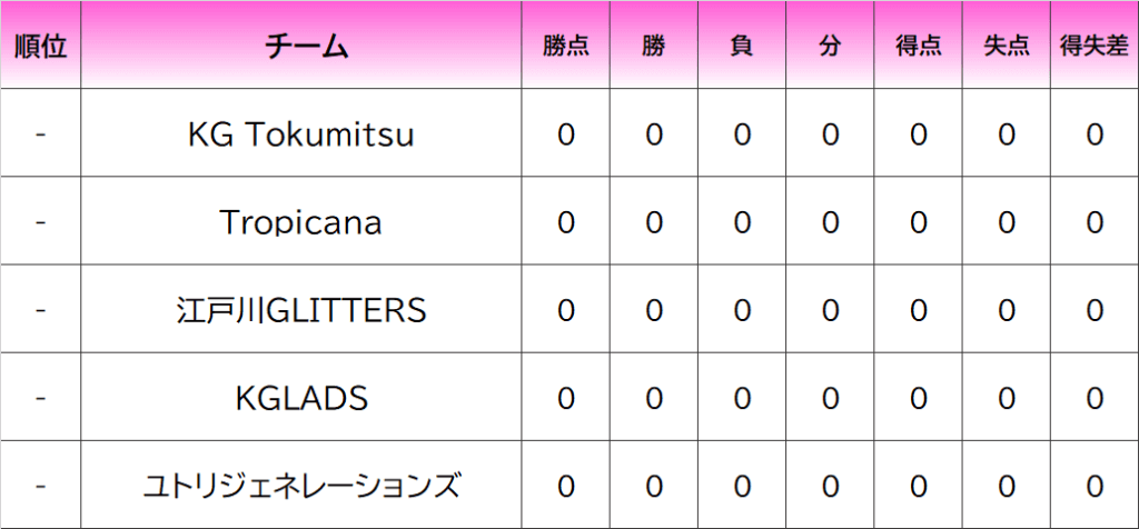 勝点>勝利数>不戦勝数*>失点数*>得失点差>直接対決結果で順位が決定